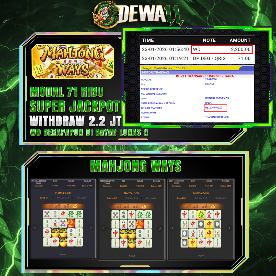 DEWA11 menghadirkan game jackpot vip yang di lengkapi fitur khusus new member hanya dengan modal deposit 71k dijamin akan withdraw 2,2 juta malam ini.